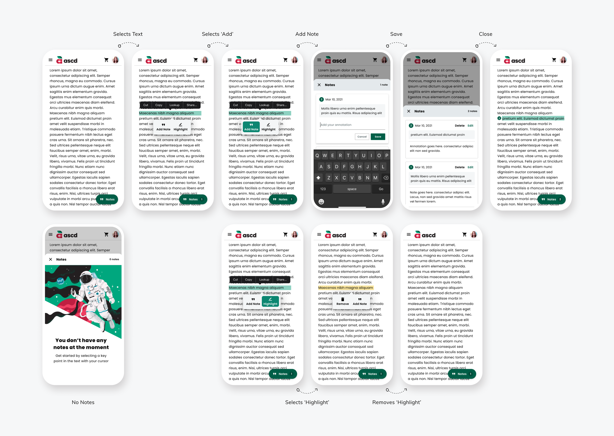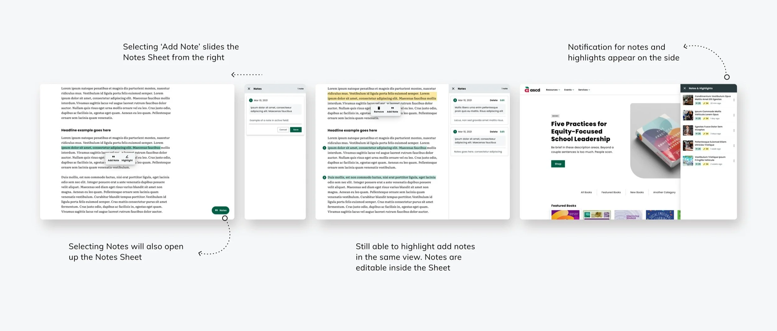 The new ASCD Notes feature lets users interact with content seamlessly. By selecting a passage and holding it down, users access the Notes/Highlight dialog. Choosing “Add Note” opens a sliding Notes Sheet with the selected passage displayed and a field to enter their note. Once saved, the passage is highlighted, and the Notes Sheet allows users to view and scroll through all their notes. A snackbar at the bottom indicates the total number of notes made, while numbered highlights provide clear visual organization.