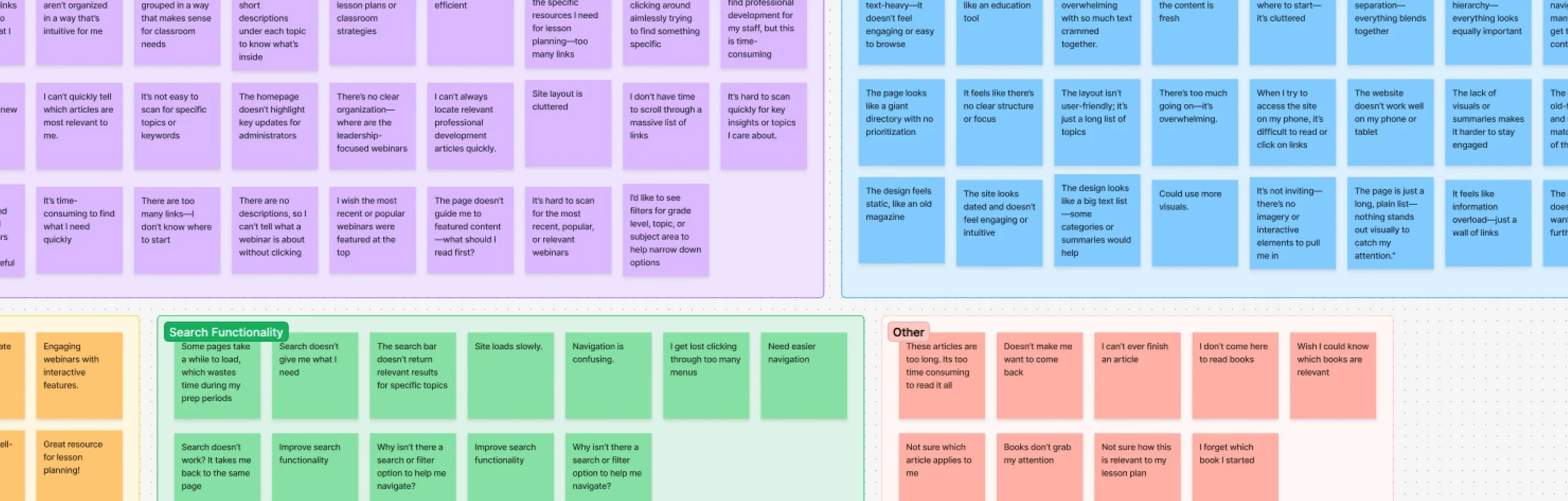 Educators and administrators reported frustrations when navigating the ASCD platform. Our user interviews revealed that the resource library lacked intuitive categorization, making it challenging for users to locate specific teaching materials. Analytics showed a 60% drop-off rate on the resource search page, confirming that users were abandoning their searches due to frustration.