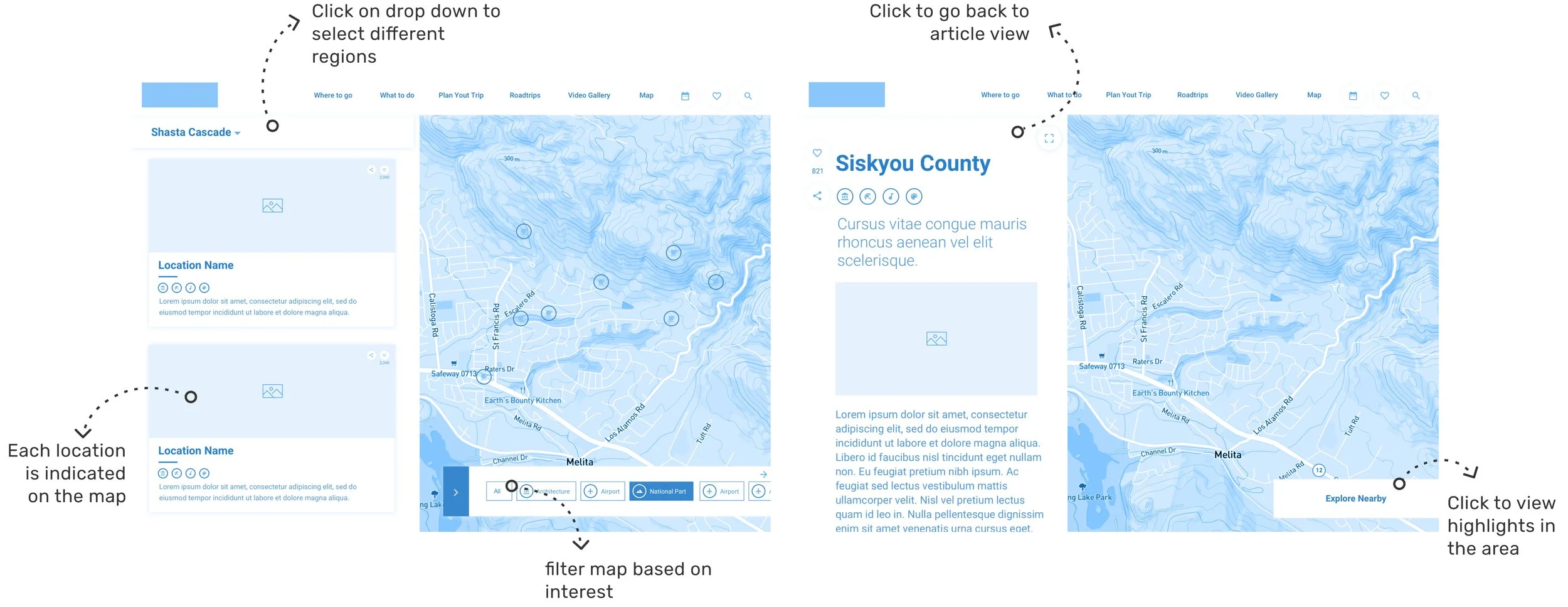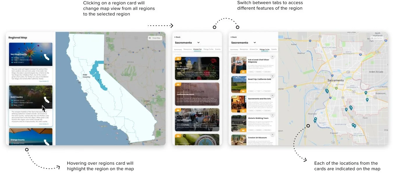 We ensured users could access the same information in the map view as they could by navigating the website. The drop-down menu allows users to switch between regions, select cities, and explore stops and activities, with the map dynamically updating based on their selections.