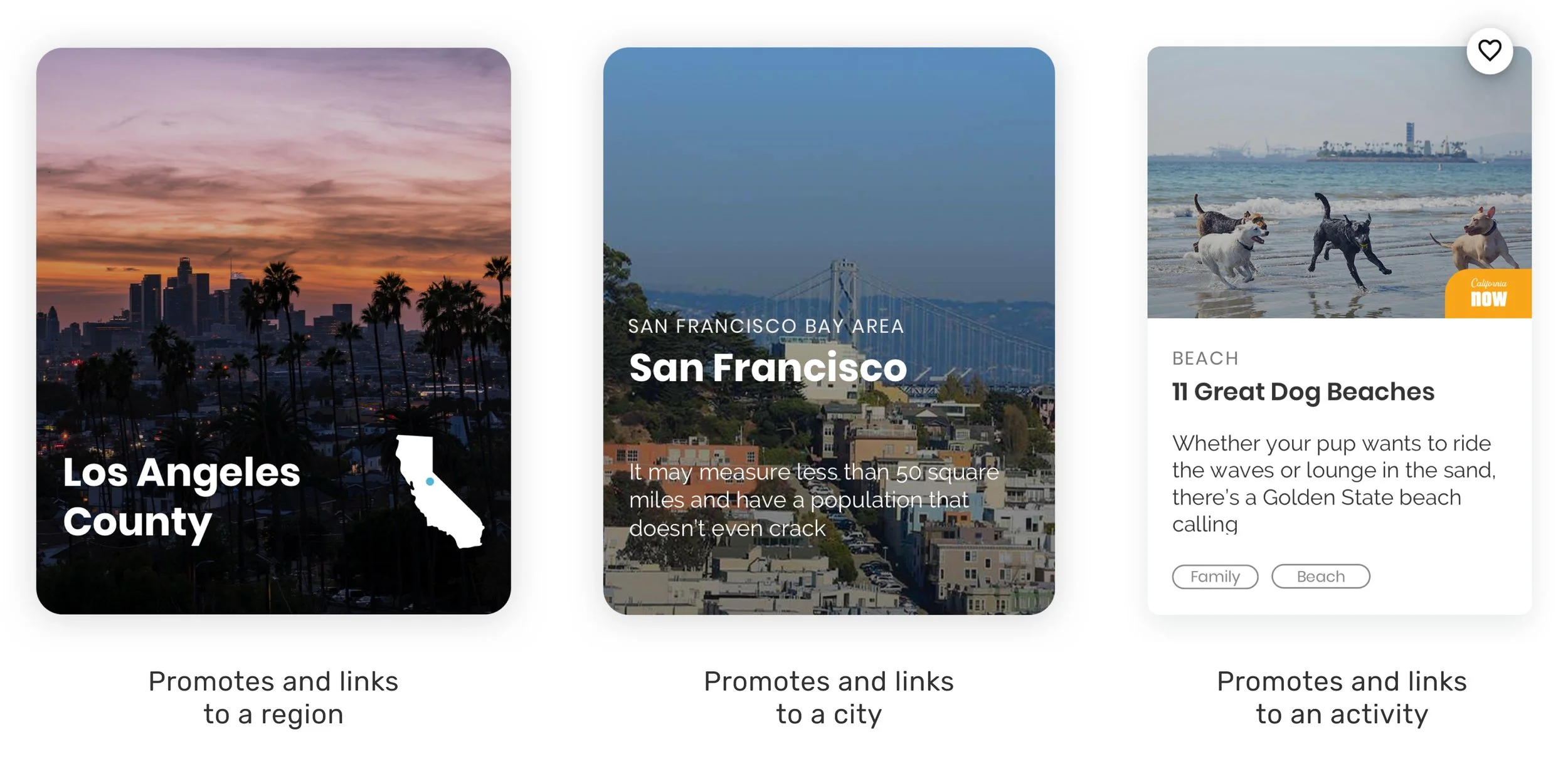 These are variations of the cards that are used throughout the website. Each card represented a trip stop, with images, distances, and short descriptions. The visual images inspire users to click to find out more about the information, while providing a clear sense of what the card represents.